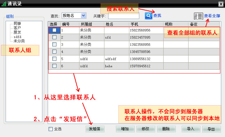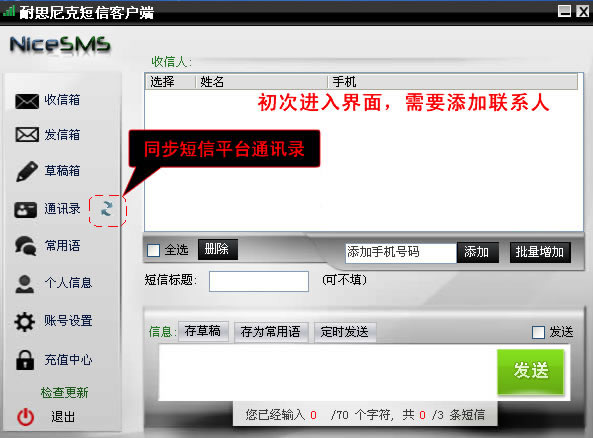 第三步,初次進入界面需要添加聯系人,如果短信平臺已經有聯系人,可以使用“同步聯系人”功能將聯系人同步到客戶端