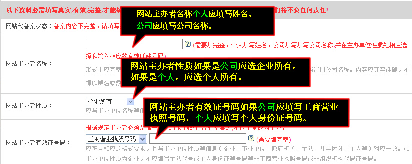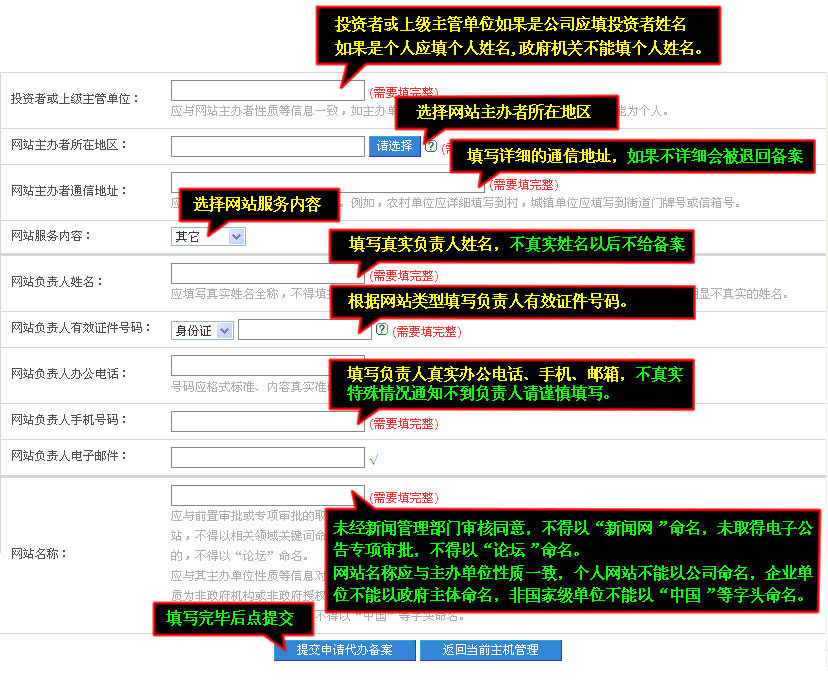 備案信息請如實完整填寫,否則信息產業部不給予通過。