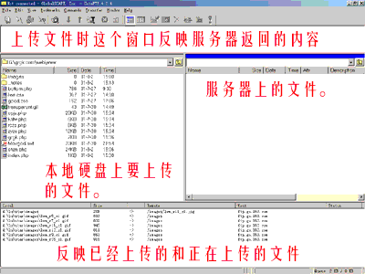 3.點擊connect鍵后,就開始連接服務器了,連接上了后,會彈出來一對話框,點擊確定后就可以上傳文件了上傳文件時的操作界面如下圖,中間兩欄左側為本地硬盤上的文件及文件夾,可以通過其上方的地址框來選擇要上傳文件所在位置,右側為服務器上的文件及文件夾,您上傳的信息均應存放在www目錄下(只需直接雙擊WWW目錄即可進入該目錄),上傳文件時只需在左側選中文件再用鼠標拖到右側即可。