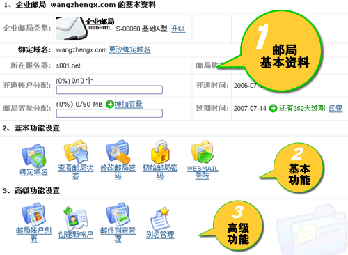 3、這樣即可進(jìn)入郵局的功能管理頁(yè)面,頁(yè)面說(shuō)明如下: