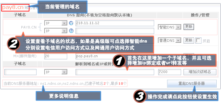 4、高級版本的DNS管理系統具有智能DNS解析功能,增加子域名后,既可選擇智能DNS功能,此時同一個子域名就有“電信”和“網通”兩個不同的設置選項,您可以有針對的分別設置。